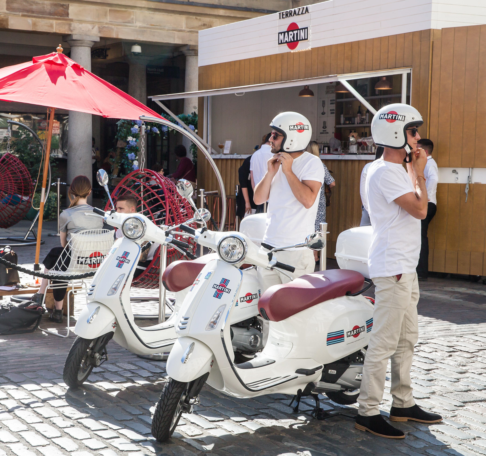 To celebrate Italian friendship, we brought the iconic Terrazza Martini to London for a 4-week pop-up on Covent Garden's piazza. In a bid to bring the relaxed way of life to Londons busy city centre, the space was transformed into an Italian sanctuary complete with iconic scooter seats and a Martini bar, where guests were able to celebrate the aperitivo hour with their friends while enjoying delicious Martini cocktails and complimentary aperitivo plates.